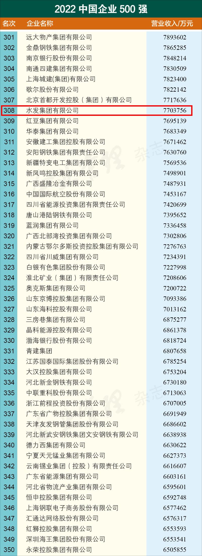 2022年9月6日,中國企業聯合會、中國企業家協會在京舉辦新聞發布會,發布了“2022中國企業500強”榜單。作為山東省屬國有企業的水發集團本次排名位列第308位,較去年提升126位。