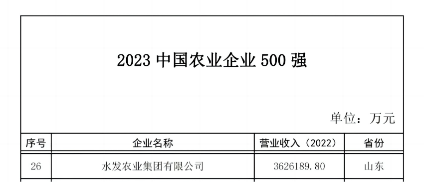 12月20日,“2023年中國農業(yè)企業(yè)500強”榜單正式發(fā)布。水發(fā)農業(yè)集團位列第26位,較去年提升11位。